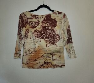 Chico's blouse with artistic print. Beige and brown tones. Ideal for casual wear. Bin M