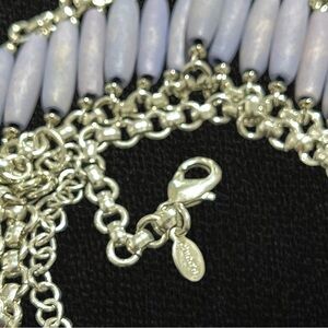 Purple ombre oblong wood beads alternating with shell, mother-of-pearl sheen, circular beads. Silver tone chain necklace with larger lobster claw closure. Necklace measures between 24"-28" with extender chain.