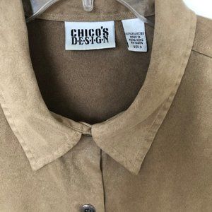 This Chico's classic style shirt has the feeling of faux suede/chamois. Versatile style to wear alone or as a layer. The soft touch of faux suede in a versatile style. Side-slit hem. Chico's Size 3 Caramel color Easy care wash & wear 100% poly