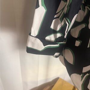 Chico's shirt with a gray and white abstract pattern. Features a stylish design for a modern look.