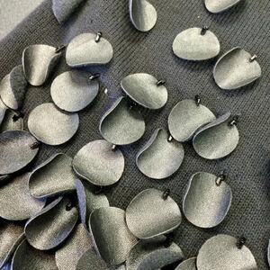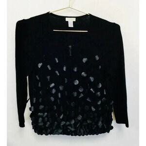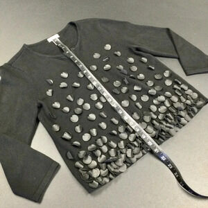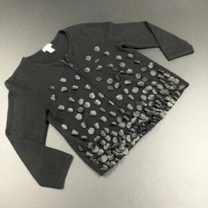 This is a pre-owned black cardigan by Chico's. It is made of 60% cotton, 20% rayon, and 20% nylon. The cardigan features a front zipper closure and is adorned with black fabric leather like embellishments in the shape of circles. The embellishments are sewn onto the front of the cardigan and extend from the neckline to the hem. The cardigan has long sleeves and a relaxed fit. The measurements are as follows: Bust: 17 inches, Length: 21 inches, Sleeve: 18 inches. The cardigan is in good condition with no visible signs of wear or damage. The fabric is soft and the embellishments are intact. The cardigan is a great option for a casual or dressy occasion.