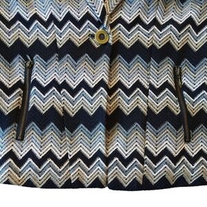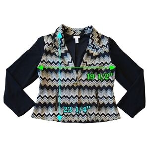 Chico's Black Chevron Zig Zag One Button Blazer Zip Pockets Mixed Media Modern
