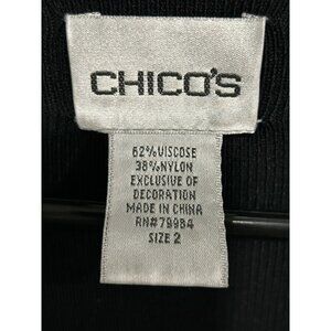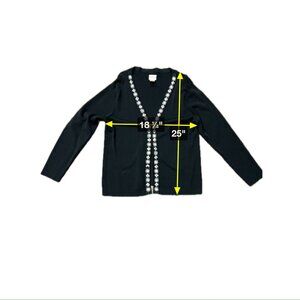 Chico's sweater, women's cardigan, black cardigan, rhinestone trim, floral trim, viscose blend, long sleeve, casual wear, elegant sweater, soft cardigan, fall fashion, chic style, embellished cardigan