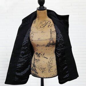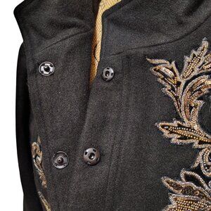 Absolutely stunning Chico’s black wool-blend jacket, size 3 (XL/16). Features ornate metallic floral embroidery and sequin detailing, soft satin lining, and concealed snap front. Elegant and warm — perfect for holiday or evening wear.