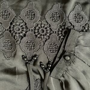 This stunning black blouse from Chico’s channels the look of Johnny Was with intricate embroidered lace insets, semi-sheer sleeves, and a flowy peasant silhouette. Finished with a tasseled tie neckline and tonal cutout detailing, it's equal parts romantic and boho — perfect for layering year-round.