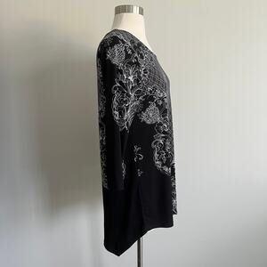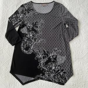 Chico's Black Floral 3/4 Sleeve Tunic Top Hankerchief Hem Chico's 0 Small