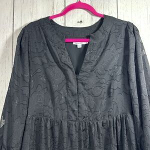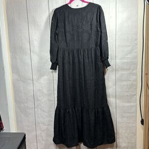 Elevated and ethereal, this long black jacquard maxi dress from Chico’s features a tonal floral pattern for a subtle yet luxe texture. With long sleeves, a tiered skirt, and a modest V-neckline, this flowy silhouette is both comfortable and effortlessly elegant—perfect for dressy occasions or styled down with boots for an edgy, romantic look.