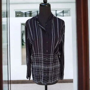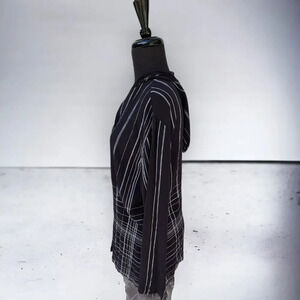 Elevate your wardrobe with this Chico's black geometric striped hoodie button-up top blouse in size 1 or 8 US. The top features a crew neckline and long sleeves with a hood for added comfort. The button closure adds a touch of elegance to the minimalist design.