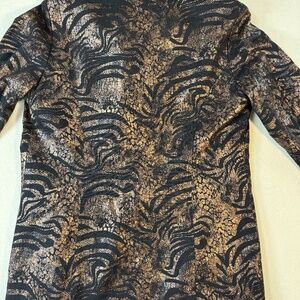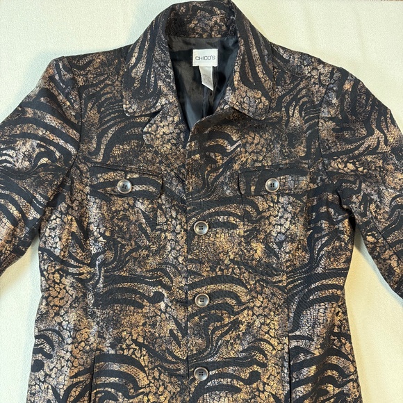 Statement Chico’s jacket featuring a rich black and gold textured jacquard pattern. Tailored silhouette with a structured collar, button-front closure, and decorative chest pockets.