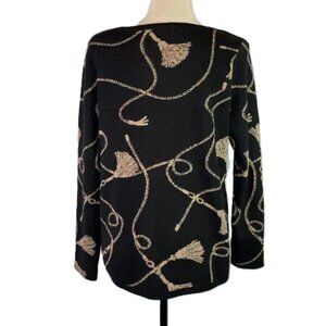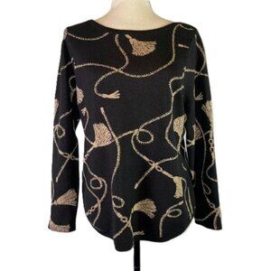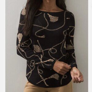 Chico's Black Gold Metallic Rope Design Sweater Size M Bateau Neck Long Sleeves