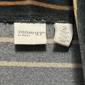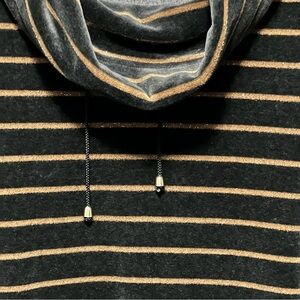 Zenergy by Chico’s Black Velour Cowl Neck Pullover with Gold Metallic Thread Stripes • Women’s Size Large 12/14 (Chico’s Size 2) • Extra Large Cowl Neck with Drawstring • Soft and Comfy with Lots of Stretch