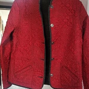 This is a Chico's red or black quilted reversible jacket with a floral pattern