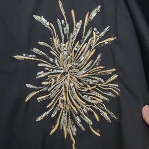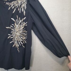 This is a Chico's Black Jersey Knit Poplin Sleeve Gold Sequined Fireworks Blouse Sz 3 (XL)