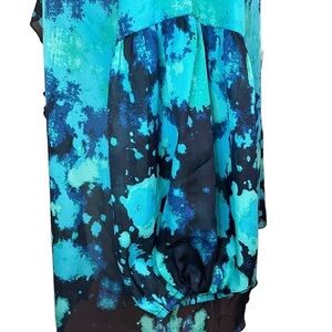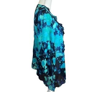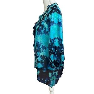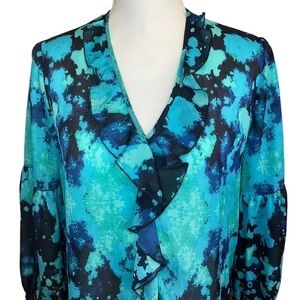 Chico's Black Label Aqua Blue Watercolor Floral Ruffle Front Blouse. Size 4