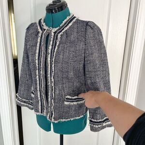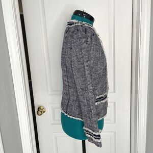 Chicos Black Label Crop Chain Fringe Frayed Pocket Unlined Tweed Blazer Jacket