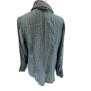Chicos Black Label Metallic Striped Teal Button-Down Blouse With Tie Neck Size 2