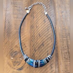 Chico's bohemian necklace features a pendant in a crescent shape made from black and teal enamel with silvertone accents on a black leather cord with a lobster claw clasp The necklace is signed Chico's. Excellent used condition
