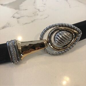 Chico’s Black Leather Mixed Metal Textured Teardrop Buckle Belt Adjustable M/L