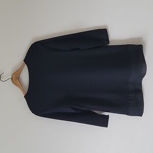 EUC black ponte-ish knit tunic. Heavier weight than a tee, thus lends to a "nicer" top that can be dressed up as well as worn to the office.