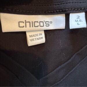 This chic black blouse from Chico's features stylish puff sleeves with ruffled detailing, adding a touch of elegance to its design. The short sleeves and smooth fabric create a sophisticated look, perfect for elevating any outfit.