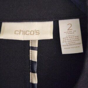 Chico's Black Ruffle 3/4 Sleeve Open Front Jacket Size L. Pit to pit 24", shoulder to hem 24", Lightweight, All Season, Closet Staple, Ruffle Collar And Cuff. Good Pre-Owned Condition