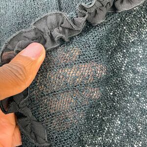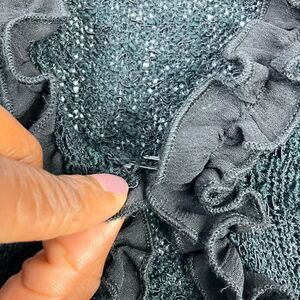 • Detail: Ruffle trim, hook clasp closure, textured knit, lightweight, slightly shimmery