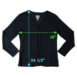 Chico's size 0 which is size 4. Good used condition, with no stains or tears. An elegant sheer black lightweight cardigan, with sequin trims. Has one eye+hook closure at the collar. The cardigan has an accompanying tank top, also with sequin trim.