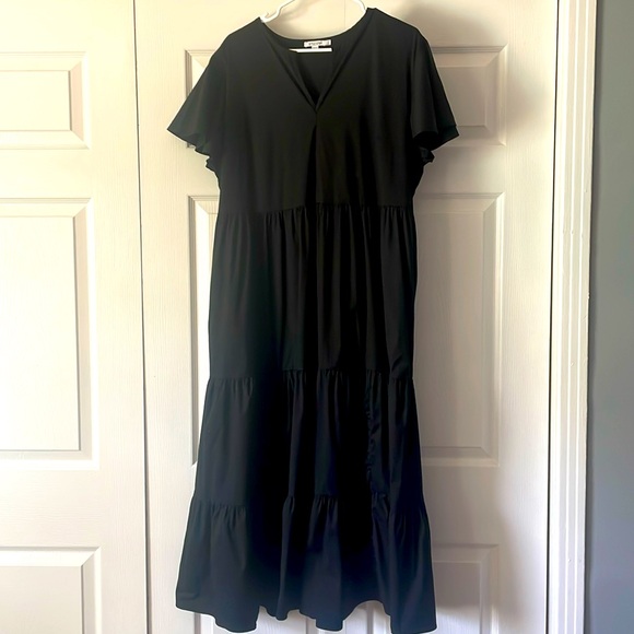 Elegant black maxi dress. Features tiered design. Short sleeves. Perfect for any occasion.