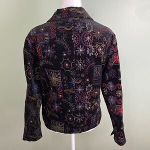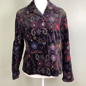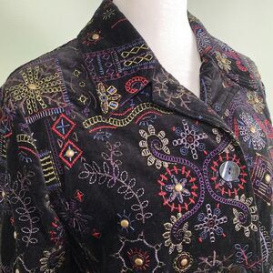 An elegant and unique Chico's blazer, crafted from a comfortable Cotton Spandex velvet blend with beautiful Embroidered detailing. This jacket blends Business Casual sophistication with a touch of Bohemian flair and Whimsy.