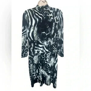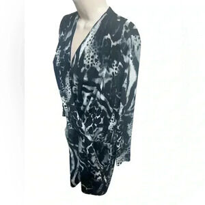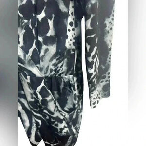 Make a statement with this bold Chico’s romper featuring a fierce black and white animal print design. This eye-catching one-piece has a flattering faux wrap front, long sleeves, and a sleek silhouette that blends style with comfort. Perfect for a night out, vacation look, or edgy daywear.