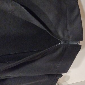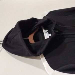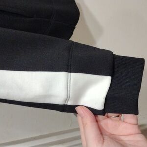 Elevate your athleisure game with this chic black and white full zip hooded jacket by Chico's. Crafted from a durable and comfortable polyester blend, this jacket features long sleeves and a zip closure for easy wear. The arm stripe accents add a touch of sporty flair, while the hood and size small fitting make it perfect for women on-the-go. This basic jacket is versatile and perfect for any occasion. It's a classic and preppy piece that belongs in every wardrobe.