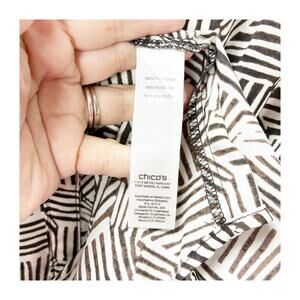 • Chico’s blouse with striking black‑and‑white geometric print, airy lightweight knit, half‑placket V‑neck and dolman sleeves for a relaxed silhouette