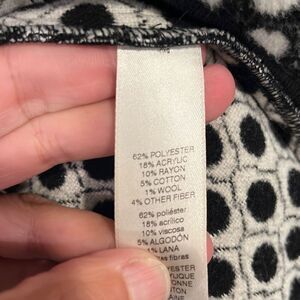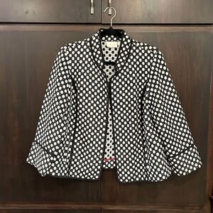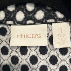 This blazer is made by Chicos. It is a black and white polka dot blazer, wool blend and open front with no buttons. Chico’s size 1 (see size chart) and in nice pre owned condition. Smoke and pet free home.