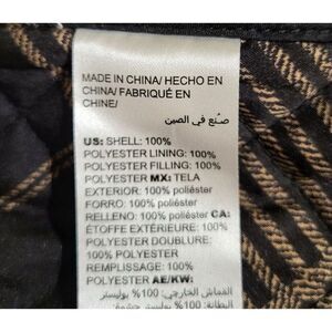 This lightweight jacket is a solid black with a diamond quilt like pattern outside and a tan and black plaid lining inside and under the collar. It can be worn as a coat when the weather cools or as a jacket with dress pants or jeans. The buttons on the sleeve can also be unbuttoned and rolled up to display the plaid lining. It also has 2 generous front pockets, 1 on each side. The label size is a Chico's size 0 which is a Reg Size 4 or X-Small. See measurements below.