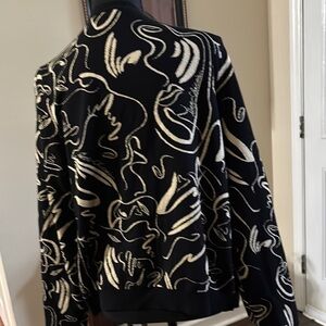This sophisticated sweater from Chico's features a striking black and cream color palette, perfect for making a bold statement. The intricate swirling pattern adds a touch of elegance, while the fitted cut ensures a flattering silhouette. Ideal for both formal and casual occasions, this piece is a must-have for any fashion-forward wardrobe.