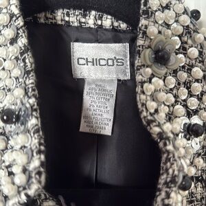 This chic Chico's blazer features a striking black and white houndstooth pattern. Sleeves with pearl and sequin embellishment as well as collar. Open style front. Excellent condition. Smoke-free home. Chico size one which equates to small or 8. See photo