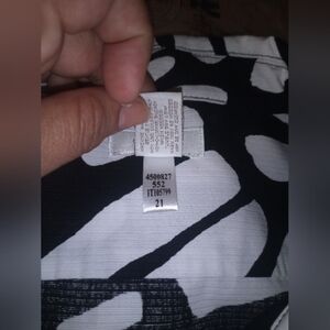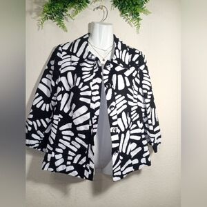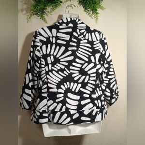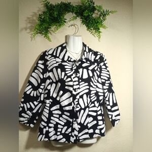 This top from Chico's features a striking black and white color scheme with a notched collar and a boxy, buttoned style. The button down shirt is designed with a bold geometric pattern, offering a dramatic and eye-catching look. Perfect for adding a touch of sophistication to any outfit.