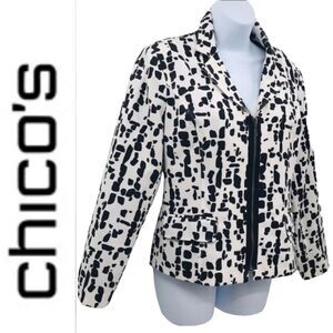 Chico’s cow print black and white full front zipper lined jacket. 2 front pockets. Stunning over a simple black dress or pants!