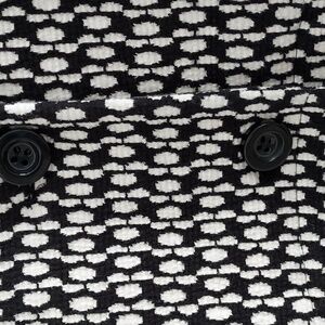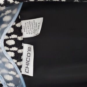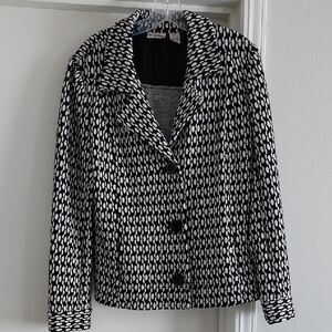 This striking blazer from Chico's features a bold black and white geometric pattern, offering a sophisticated and modern look. The tailored fit and structured design make it a versatile addition to any wardrobe, perfect for both professional and casual settings. It measures 22" armpit to armpit and 26" shoulder to hem.