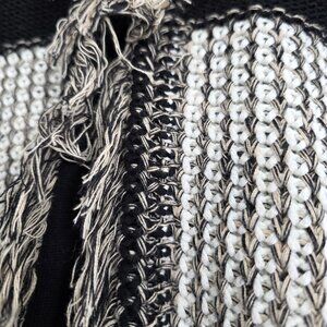 A striking, highly-textured knit cardigan/jacket from Chico's. This unique piece features a dynamic black and white geometric pattern and is finished with a stylish fringe trim along the open front and hem.