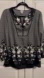 Chico's tunic with intricate black and white design. Features long sleeves and a flattering neckline. Perfect for versatile styling.