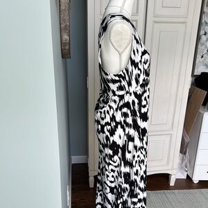 This chic sundress by Chico's features a striking black and white pattern, perfect for casual or resort wear. The sleeveless design and V-neckline offer a breezy feel, while the maxi length adds a touch of elegance. Crafted from a lightweight fabric, it ensures comfort and style for any relaxed occasion. Excellent condition. Lots of stretch. All measurements are approximate. Pit to pit is 20" shoulder to hem is 55" 95% rayon 5% spandex machine wash cold