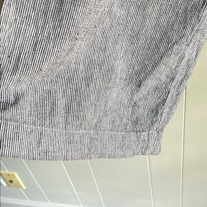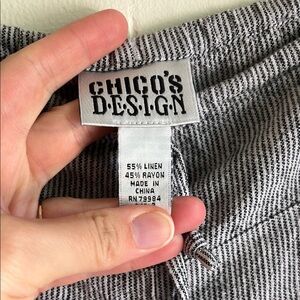 Stylish wide leg pants by Chico's. Features a black and white striped pattern. Comfortable and chic design.