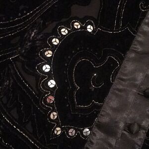 Velvet with Pattern that Includes Sheer Areas, Sequins at different places, Satin Trim and Covered Buttons, and Gold Metallic