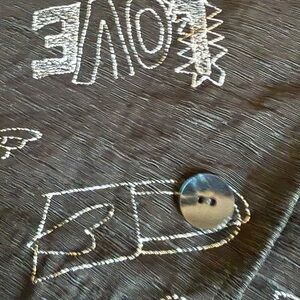Add a bold and playful statement to your wardrobe with this unique Chico’s button-down shirt featuring an eye-catching black and white print. The design includes whimsical stick figures, hand-drawn style art, and uplifting words like “Love,” “Smile,” and “Pretty.” Made from a luxurious silk-linen blend, this piece is lightweight, breathable, and perfect for creative styling.