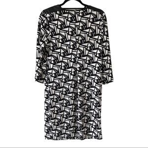 Chico’s Black/White Abstract Pattern Faux Leather Trim Shift Dress Size Small