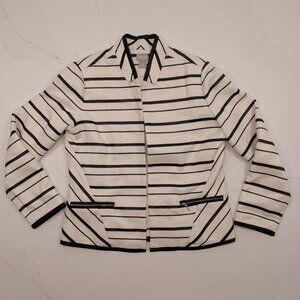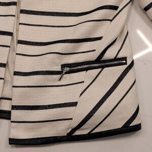 Chico's Textured Stripe Open-Front Jacket / Blazer. Chic and striking sophisticated, modern, or Quiet Luxury work office wardrobe. Bold monochrome crisp white base with horizontal black stripes, dynamic textured. Sleek open-front design and accented with faux leather collar trim and zipper pockets