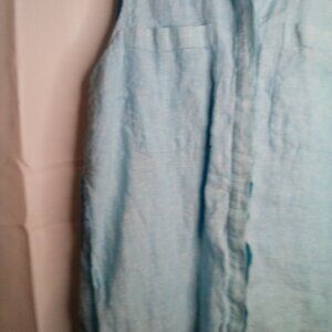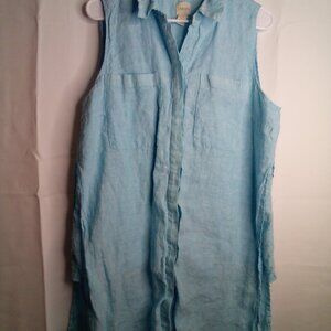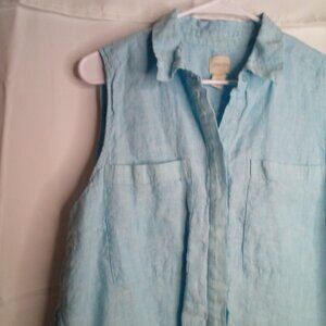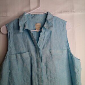 Chico's Blouse 2 L Sleeveless Button Up Pockets Side Slit 100% Linen Blue
