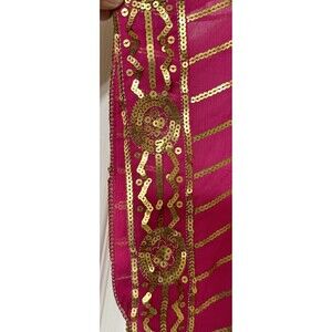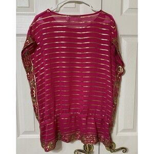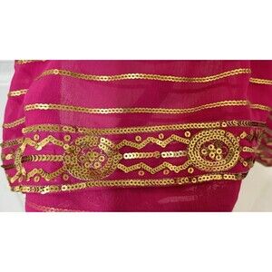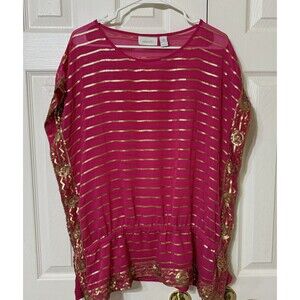 This Chico's blouse is an elegant addition to your wardrobe. The pink color and gold sparkle accents make it perfect for a party or casual occasion. The blouse has a round neckline and a pullover closure. The fabric is made of polyester mesh chiffon, making it semi-sheer. The peplum hem adds a touch of elegance and style to the blouse. The blouse is available in size 3 and fits regular size. The garment care requires hand wash only. The blouse is perfect for a festival, beach, date night, party, or bohemian theme.