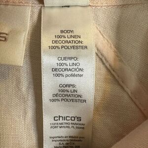 This Chicos blouse for women, size 2, is made from pure linen in a solid beige color. It features short sleeves, a full zip front, and a collared neckline, offering a stylish and breathable option for warm weather.
